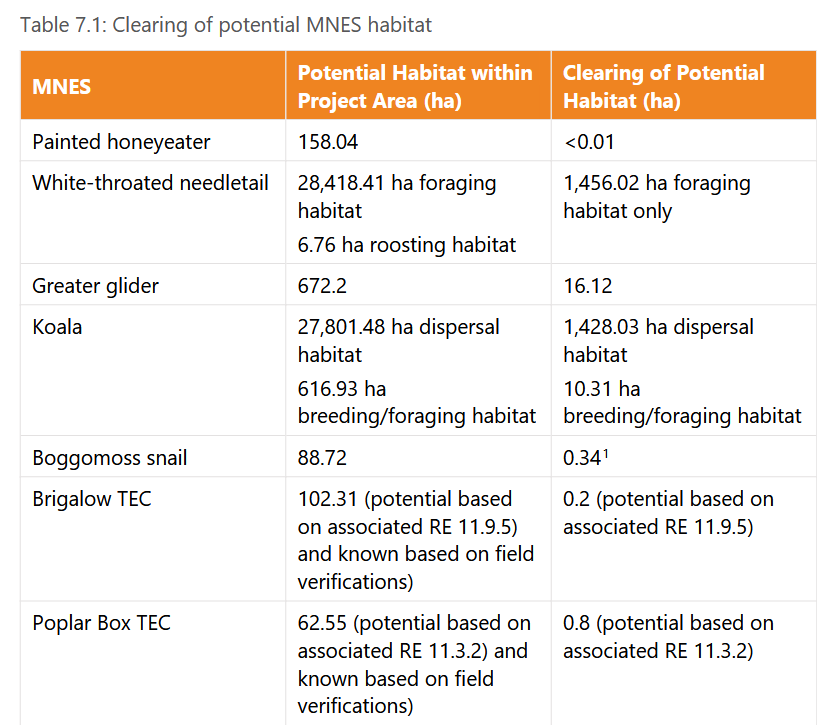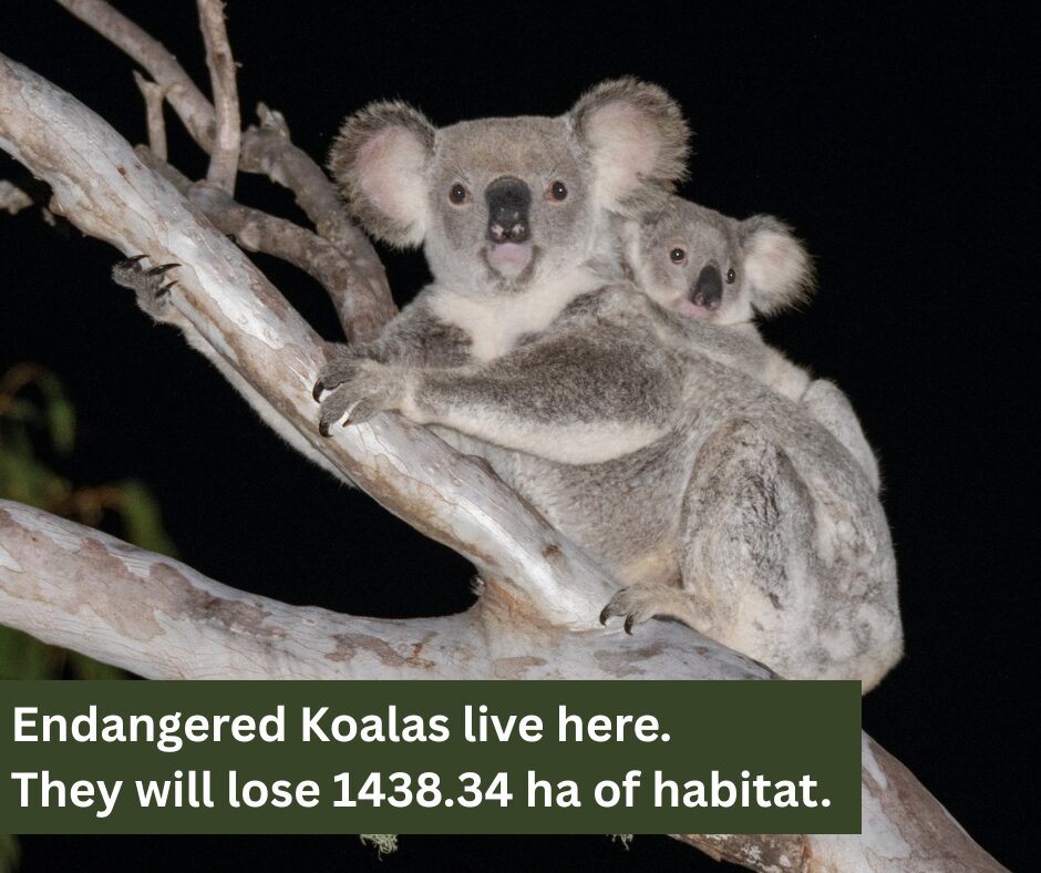Koalas are known to live here but will lose 10.31 ha of breeding and foraging habitat plus 1,428.03 ha of dispersal habitat. This is a catastrophic impact to a beloved and iconic species clinging for life.