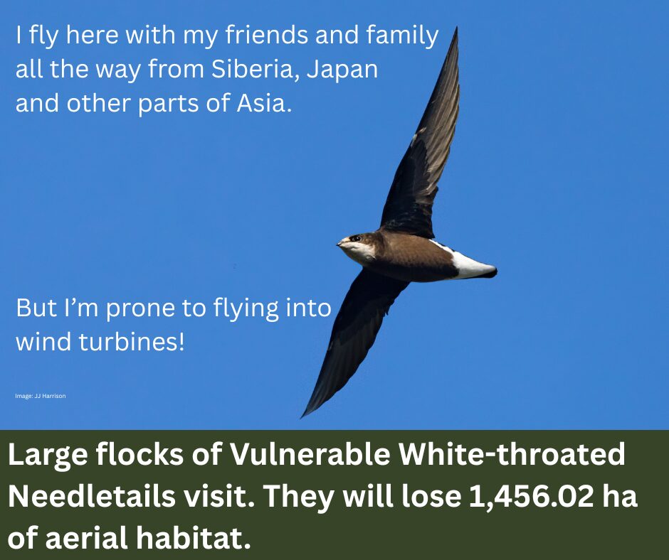 Flocks up to 220 of Vulnerable migratory White throated Needletails were spotted onsite by ecologists. They are prone to dying from turbine strike as they fly at the same height as the wind turbine rotor. They will fly into the path of wind turbines and die. The ecologists consider that the project wont have a significant impact on the White Throated Needletail population but we question why. It’s entirely plausible that flocks could be killed.